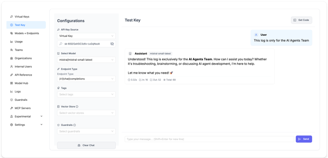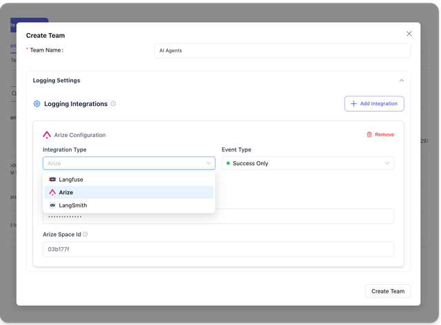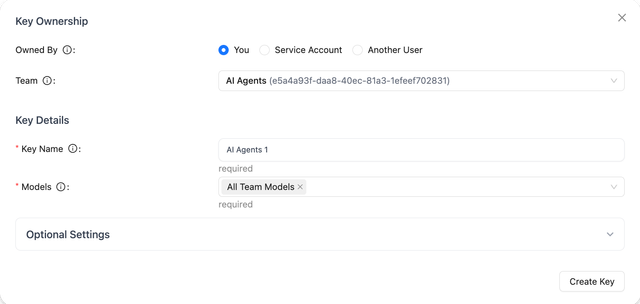 We will create a key for the team "AI Agents". The team logging settings will be used for all keys created for the team.