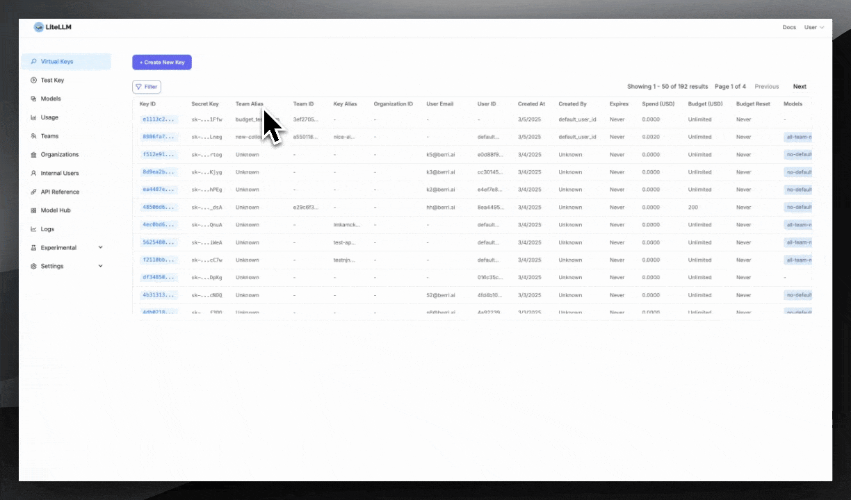 Navigate to http://localhost:4000/ui and create a new virtual Key.